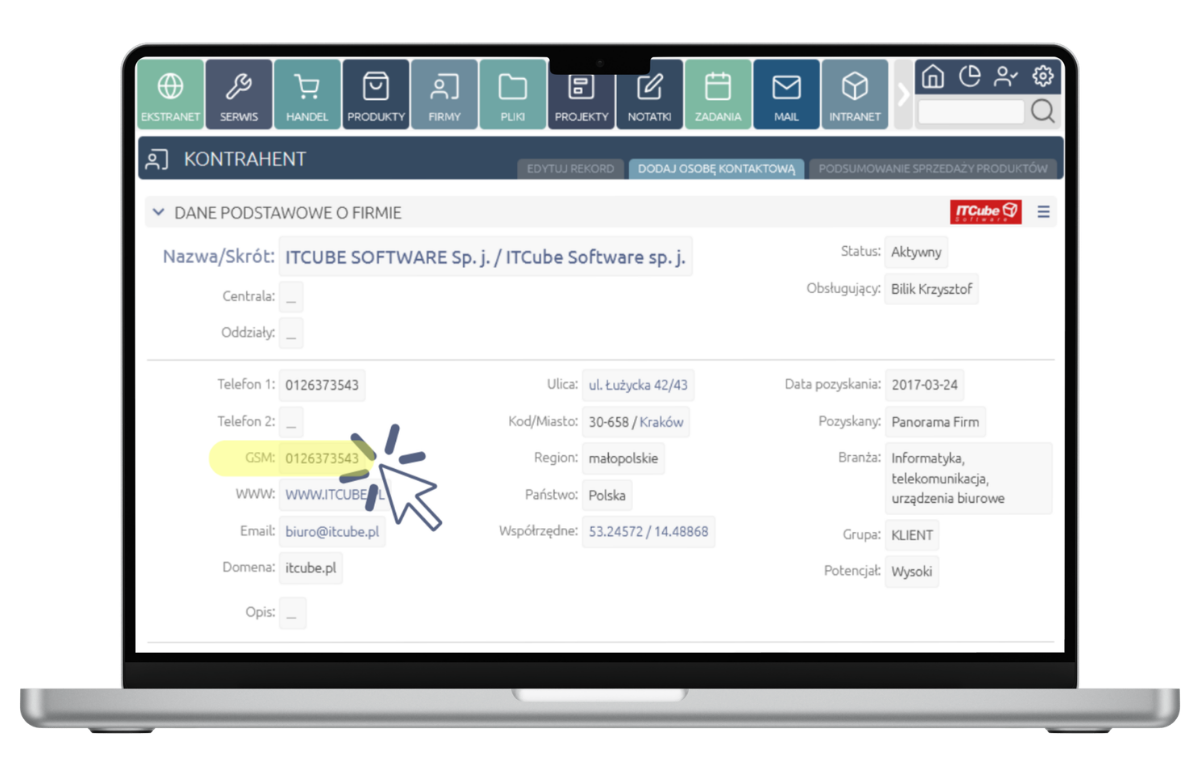 Rozszerzenie CTI umożliwia użytkownikowi wybieranie numeru bezpośrednio z poziomu aplikacji CRM. Aby zadzwonić do danego kontrahenta bądź osoby kontaktowej wystarczy kliknąć w numer telefonu. Następnie program łączy się z centralą telefoniczną i automatycznie wybiera numer. W ten sposób unikniemy czasochłonnego klikania w klawiaturę telefonu oraz pomyłek.