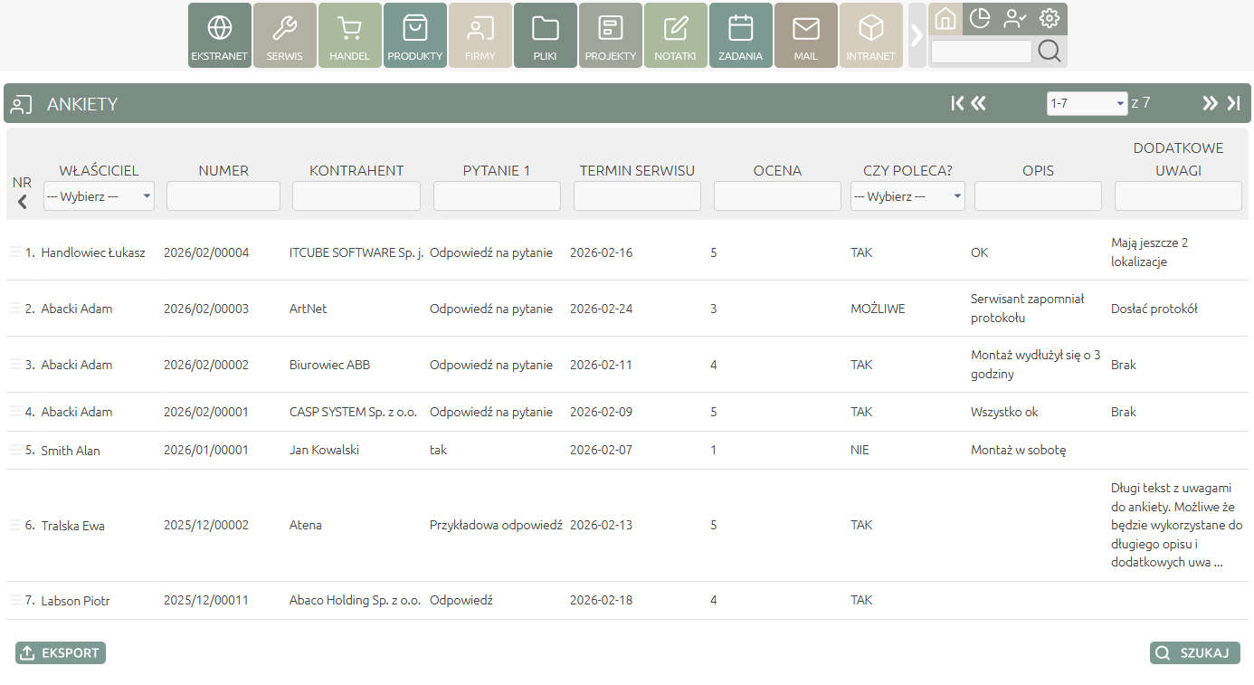 Po dodaniu nowego formularza nasz system CRM automatycznie generuje przeglądarkę z nim związaną. Administrator aplikacji może wskazać, które pola z formularza będą służyły do wyszukiwania danych. Tak utworzona przeglądarka nie różni się niczym od tych standardowo wbudowanych w systemie zarządzania relacjami z klientami. Umożliwia zaawansowane wyszukiwanie danych, sortowanie względem dowolnej z kolumn, dodawanie, ukrywanie kolumn. Dodatkowo użytkownicy mający odpowiednie uprawnienie mogą eksportować dane z dodatkowych formularzy do formatu CSV a następnie analizować je w programie Excel.