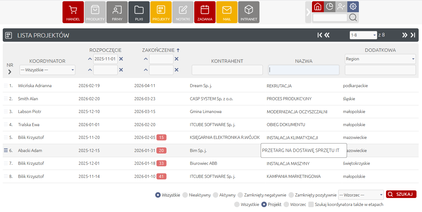 Moduł PROJEKTY oferuje możliwość tworzenia projektów o dowolnie złożonej strukturze. Dla każdego z projektów wyznaczony zostaje zespół realizujący, zbiór etapów oraz docelowa grupa klientów. Ponad to użytkownik definiuje ramy czasowe zakończenia poszczególnych etapów, planowany koszt oraz zysk na poszczególnych etapach jego realizacji. Dzięki temu użytkownik w systemie CRM może łatwo sprawdzić zyskowność projektu. Narzędzie zapewnia także łatwe wyszukiwanie i monitorowanie projektów, w szczególności tych opóźnionych.