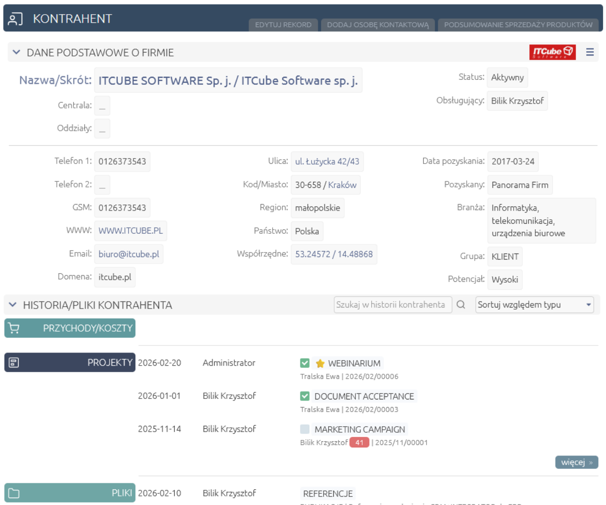 Moduł PROJEKTY umożliwia pracownikom budowanie bardzo szczegółowej historii projektu. Wszystkie informacje wprowadzane do systemu CRM takie jak notatki, zadania, oferty, zamówienia, faktury, pliki, korespondencja wysłana oraz odebrana, koszty, obiekty serwisowe mogą zostać poszerzone o kontekst projektu. Podejście takie gwarantuje możliwość wiernego, bardzo szczegółowego odtworzenia historii projektu.