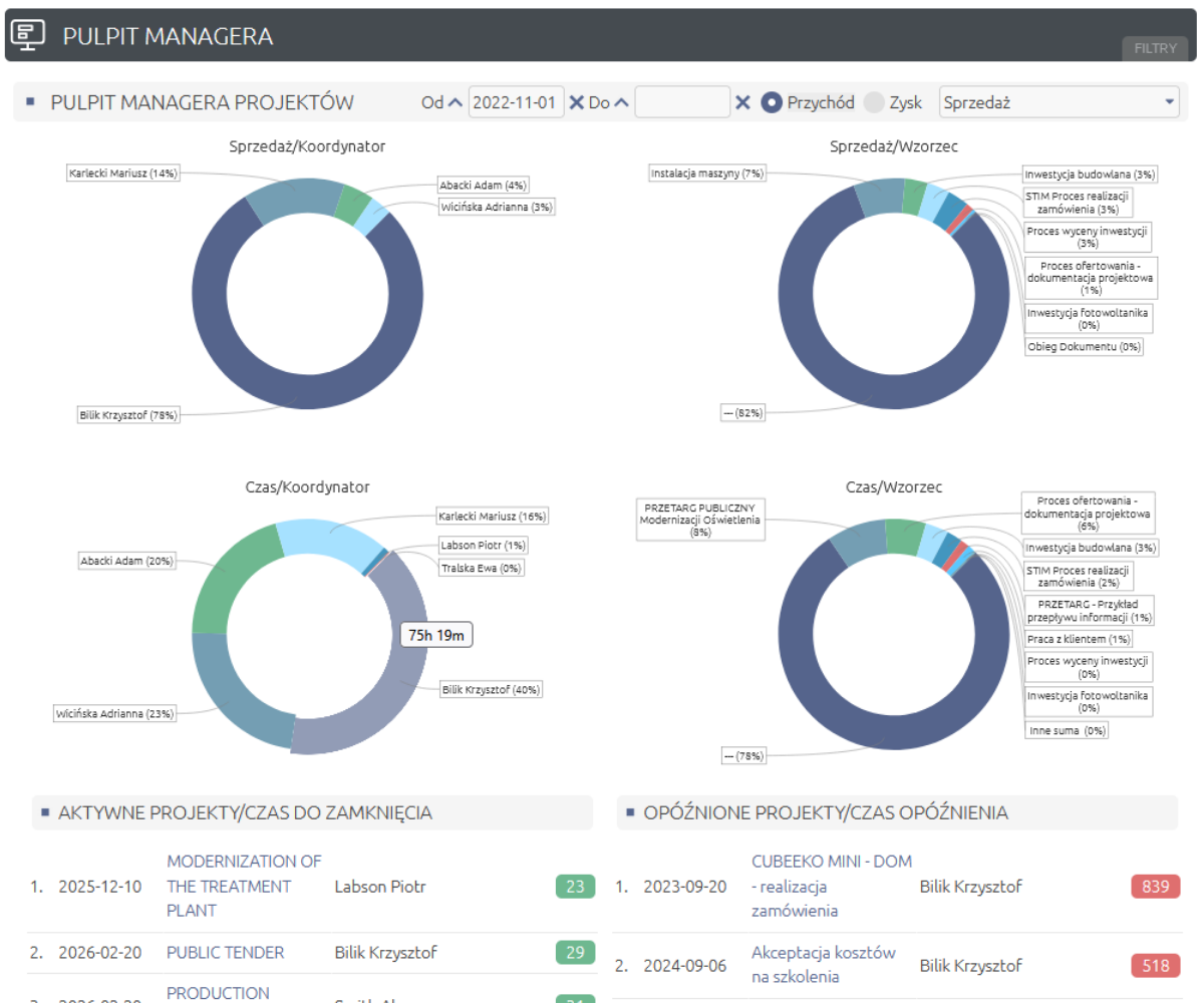W oprogramowaniu CRM każdy z projektów może zostać poddany gruntownej analizie tak by możliwa była kontrola poczynań zespołu realizującego oraz zaawansowania prac w ramach poszczególnych etapów. Oczywiście analizie poddawane są także zyski oraz koszty poniesione w ramach całego procesu co umożliwia proste sprawdzenie jego rentowności. Warto także zwrócić uwagę na pulpit managera projektowego, który oprócz kompleksowych analiz ułatwia także monitorowanie prowadzonych projektów, w szczególności tych opóźnionych. Wszystkie analizy są też dostępne w intefejsie mobilnym.